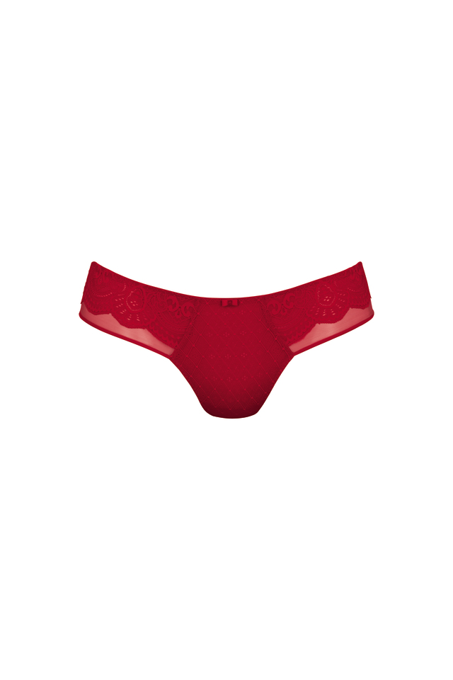 Härligt vacker baksidan på Selma Brazilian. Filigranspetsbroderi på transparent tyll ger underdelen ett fräckt utseende och smickrar rumpan. Matcha med Selma överdel för ett kryddigt set.